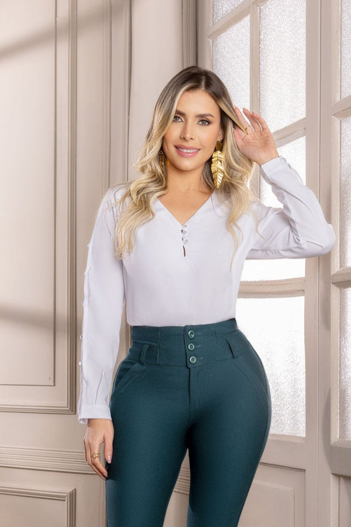Esta blusa con mangas largas en crepé está diseñada para mujeres que aman lucir cómodas, modernas y elegantes sin esfuerzo. Su silueta semiajustada se adapta a tu figura realzando lo mejor de ti, mientras que el escote en V con botones decorativos y los manga larga y botones le aportan ese toque romántico y sofisticado que marca la diferencia.